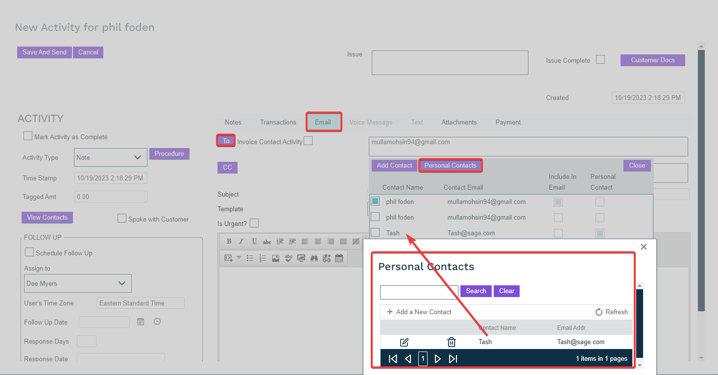 - From here you can add, delete, or edit personal/internal contacts with their name and email