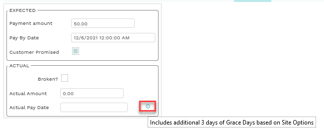 After a promise to pay activity is entered, hovering over the info icon will display the additional days for the Grace Days on the payment tab within the actual section.