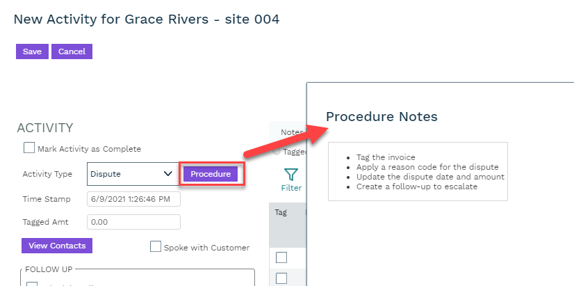 When procedure notes are included on an activity type, the procedure button will appear when the activity type is selected within a new activity: