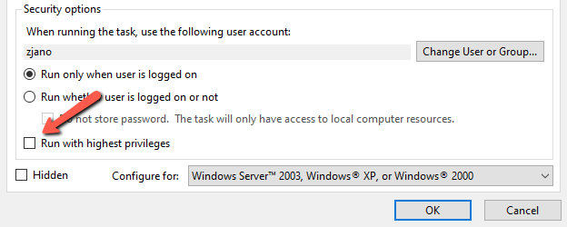 Check the "Run with Highest Privileges" box then select "OK" to confirm.