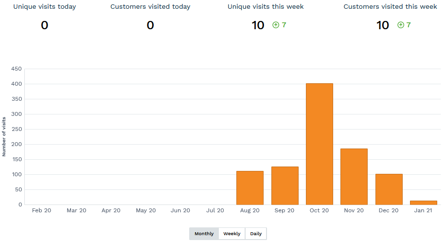 Hovering over the assorted bars will give you a quick summary of the amount of customers who visited that month as well as how many unique visits were made. This graph can be adjusted to breakdown data by a monthly/weekly/daily basis.