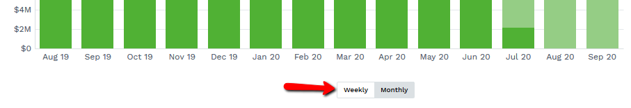 Clicking on any of the bars in the graph will allow you to see the information used in the calculation. This data will be a combination of predicted payment records and actually accepted payment records for that time period. This works on both the Monthly and Weekly breakdowns.