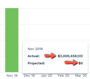By hovering over a previous month, you will see the amount that was projected for that month as well as the actual dollar amount collected.