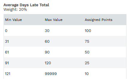 Each field will have a series of parameters setup with a minimum and maximum value. These parameters are maintained on the "Admin Settings & Utilities Site Options (ATC Credit Score)" page. The bracket that the customer falls into for each field will determine how many points are contributed to the total score. In the example below, if the customer's average days late total is "65," they will receive 50 points.
