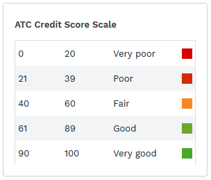 In the credit tab, it will also display a colored scale rating according to their score. These colors and parameters can also be adjusted on the "Admin Settings & Utilities Site Options (ATC Credit Score)" page alongside the fields used in the calculation. Work with a SARA representative to adjust the color scheme/parameters/description of these. The below picture is what will be set by default.