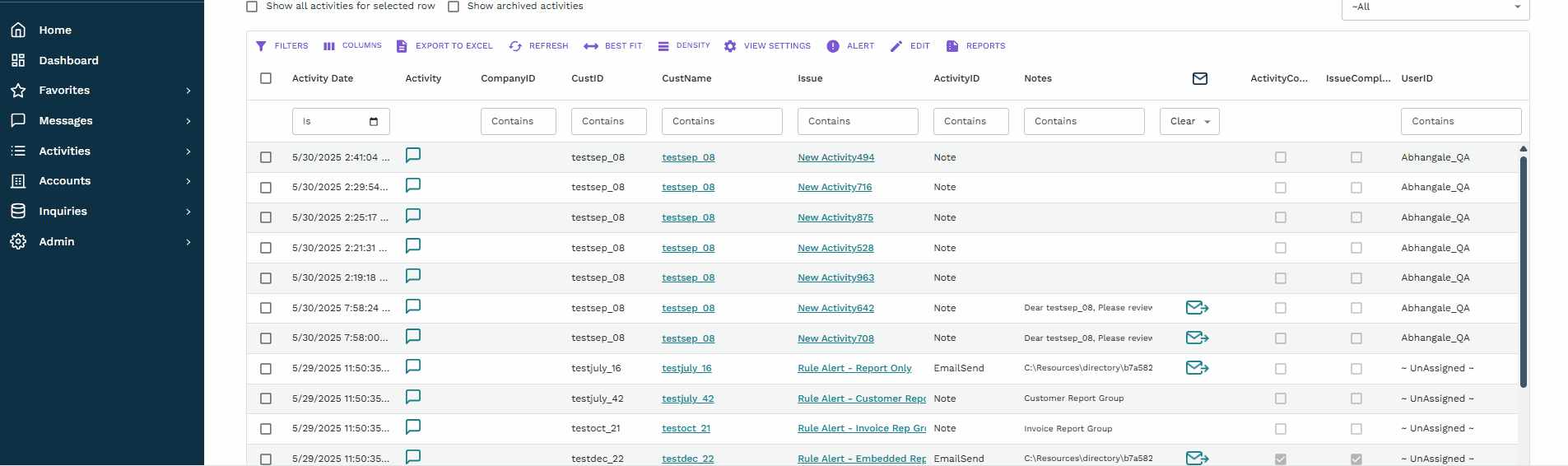 Navigate to "Inquiries> By User> Activities".