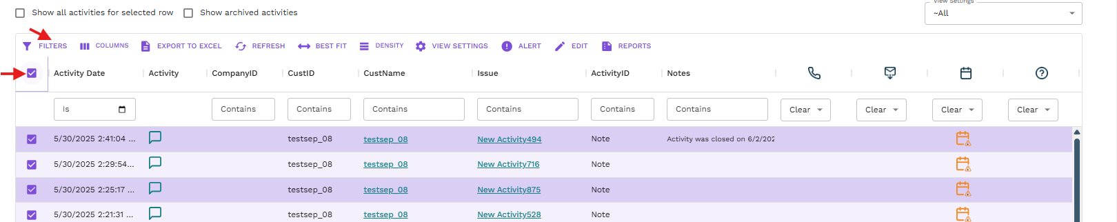 If there is a need to close multiple activities in bulk, apply the desired filters using the Filter Builder option on the toolbar. Then, select all records by clicking the small checkbox present on the column header grid, as visible in the screenshots below.