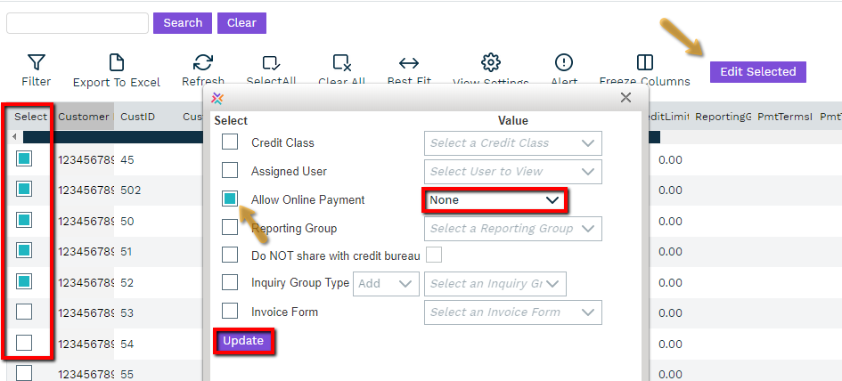 Users have the ability to update the online payment method for individual customers. The current methods being as follows: