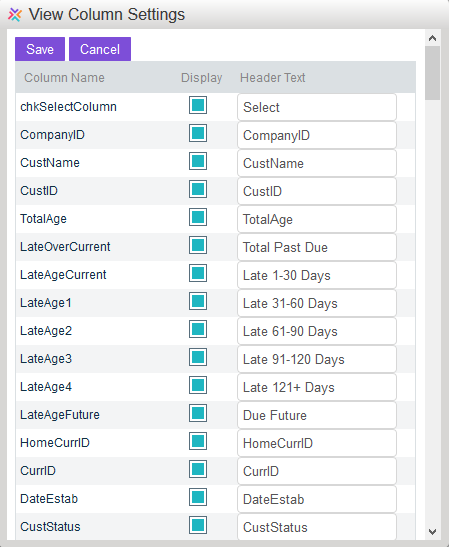On the "Column Settings" window users can hide or columns by enabling or disabling the "Display" checkbox.