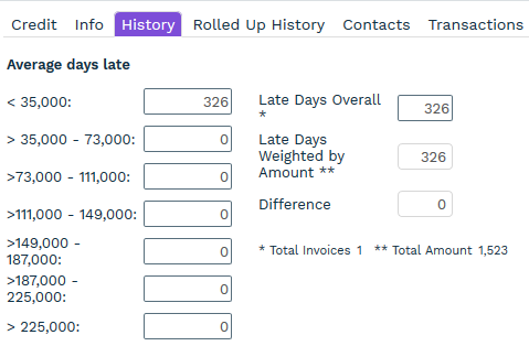 Average Days Late Weighted (AvgDaysLateWeighted) - Represents the average number of days they are late on paying any invoice (regardless of invoice size) but weighted based on the amount past due. See below for more information.