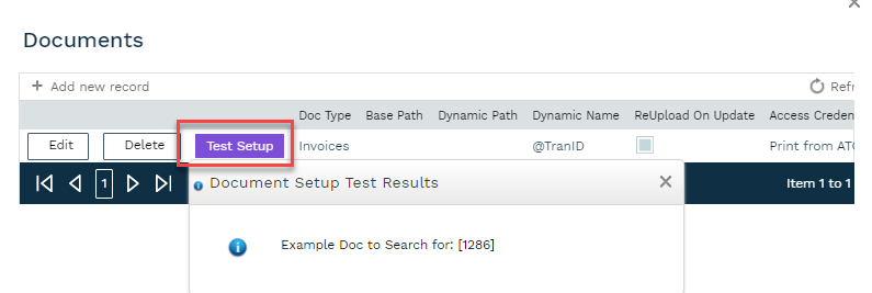 After update or insert of document setup - Test Setup button will provide example of PDF file name along with message indicating any potential duplicates based on setup and invoice data: