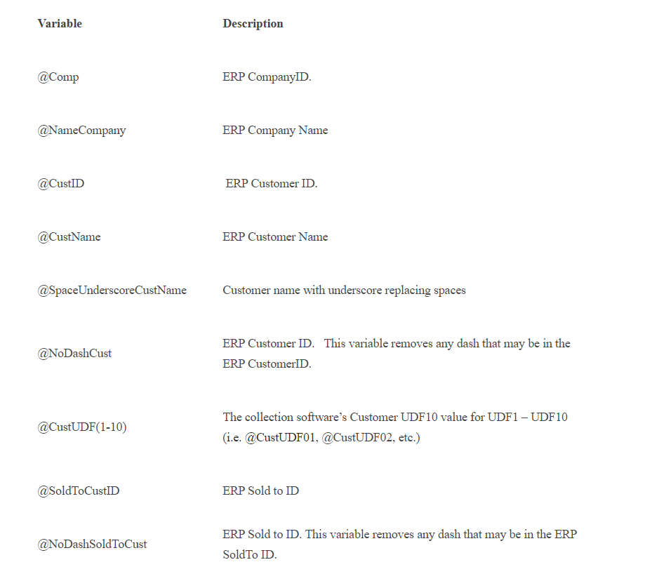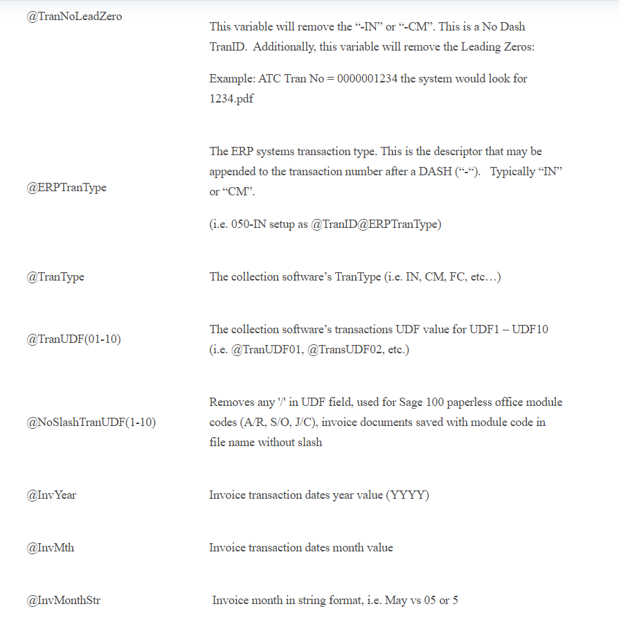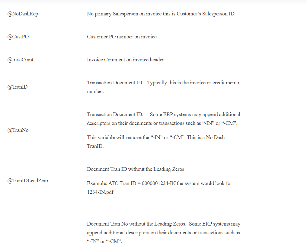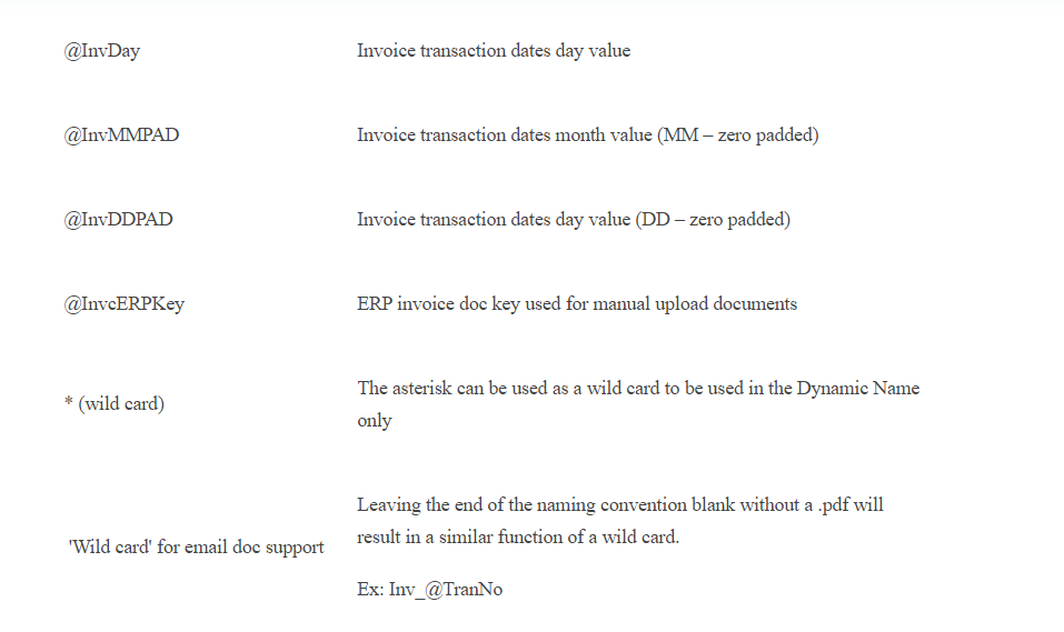 Dynamic Invoice Name: Used to define your invoice document file names using the available variables. File type should always be included in the Dynamic Invoice name and is required with the exception of the following (example: @InvcERPKey.pdf)