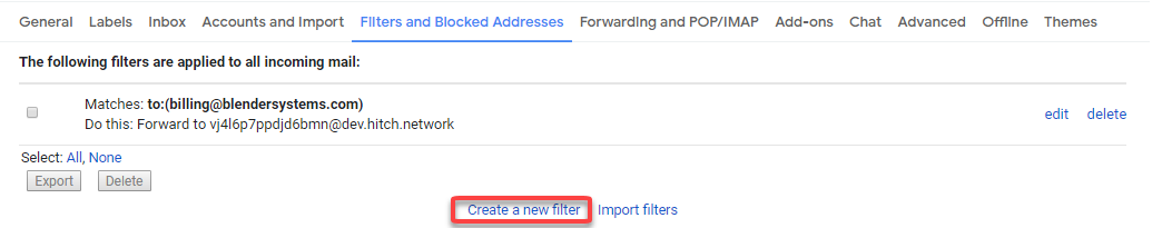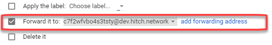 Step 5. Choose the Hitch e-mail address (e.g. cf2erdf4dfas3@hitch.network) to forward the e-mails matching this criteria and select "Create Filter"